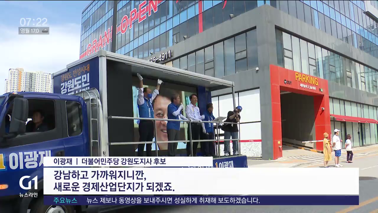 송기헌 국회의원 등 민주당 인사와 함께 유세차에 오른 이 후보는 일 잘하는 이광재를 내세웠습니다.