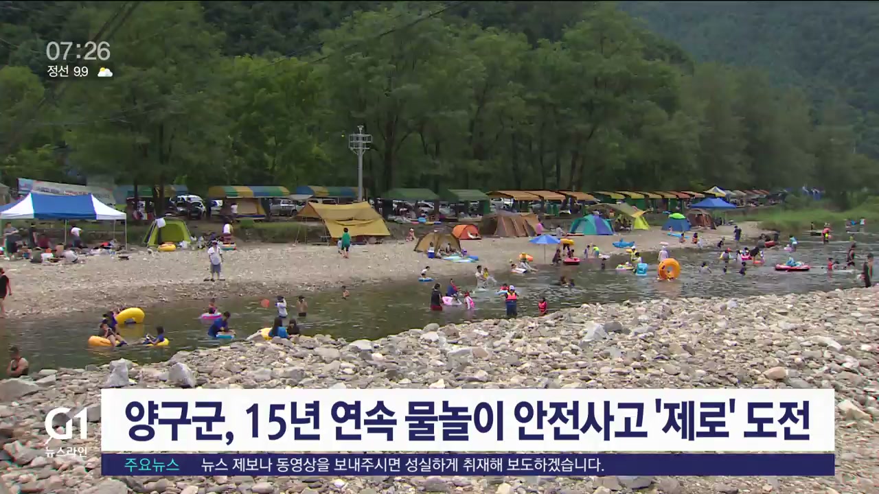양구군이 주민 안전을 위해 오늘(1일)부터 8월 31일까지를 여름철 물놀이 대책 기간으로 정하고 '15년 연속 안전사고 제로(Zero)화'에 나섭니다.