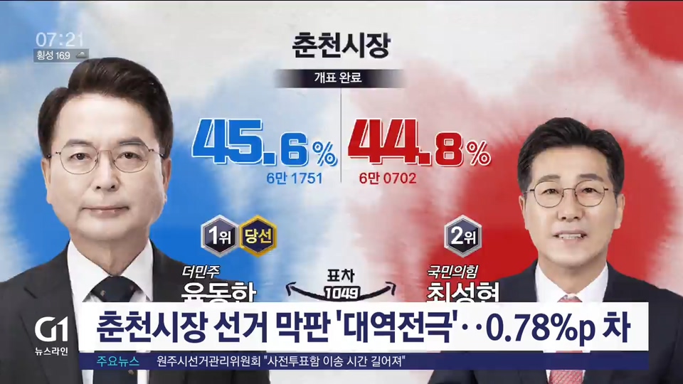 정선에서는 더불어민주당 최승준 후보가 51.01%를 얻으며, 49.98%의 국민의힘 홍천식 후보를 가까스로 누르고 3선에 성공했습니다.