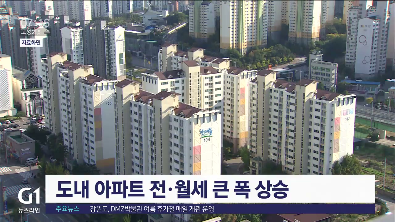 한국부동산원의 주택가격 동향조사에 따르면 지난달 도내 평균 아파트 전셋값은 1억4천2백여만 원, 월세값은 54만9천 원으로 지난해 같은 기간에 비해 각각 11.5%, 10.4% 증가했습니다.
