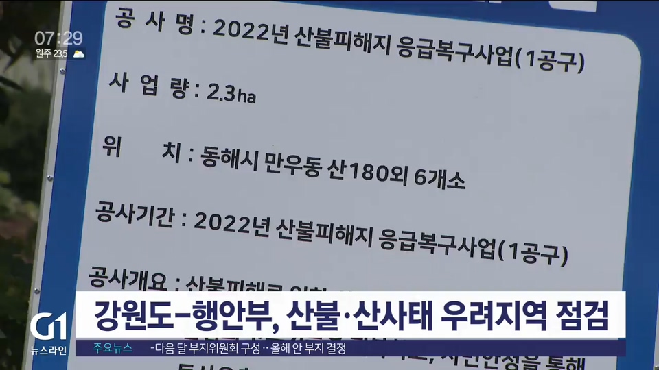 주요 점검 현장은 동해시 만우동 산불피해지 응급복구 사업장과 삼척시 가곡면 오저 2지구 급경사지 붕괴위험지역 정비사업장 등 입니다.