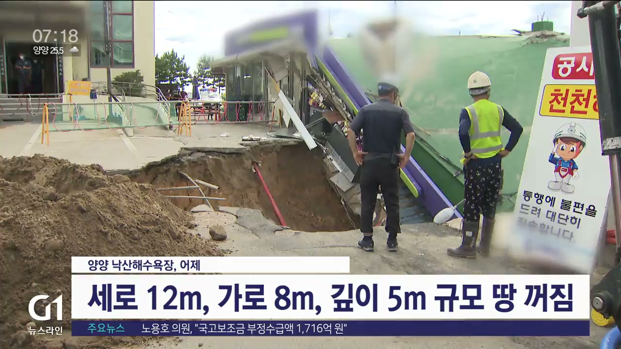 어제 오전 6시 43분쯤 양양군 낙산해변 인근 도로에서 넓이 100㎡, 깊이 5m 규모의 땅 꺼짐이 발생했습니다.