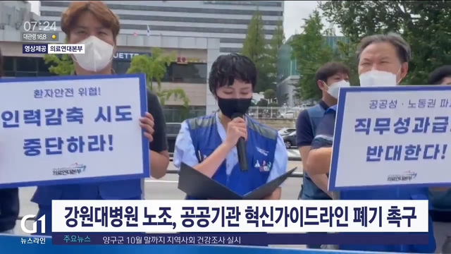 강원대병원 노조가 어제(23일) 대통령집무실 인근에서 기자회견을 열고, 공공기관 혁신 가이드라인 폐기를 촉구했습니다.