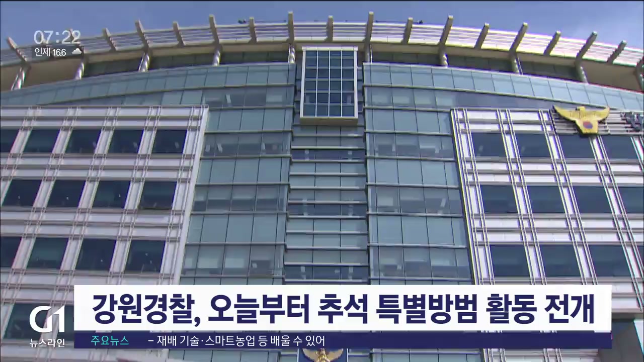 강원경찰청이 사회적 거리두기 해제 이후 처음으로 맞는 추석 명절에 대비해 오늘(29일)부터 2주간 특별방범 활동을 전개합니다.