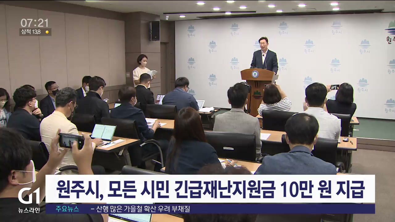 원강수 원주시장은 어제(20일) 시청 브리핑룸에서 현안 보고회를 통해, 363억 원의 예산을 투입해 원주에 거주하는 시민 1인당 10만 원씩을 지급한다고 밝혔습니다.