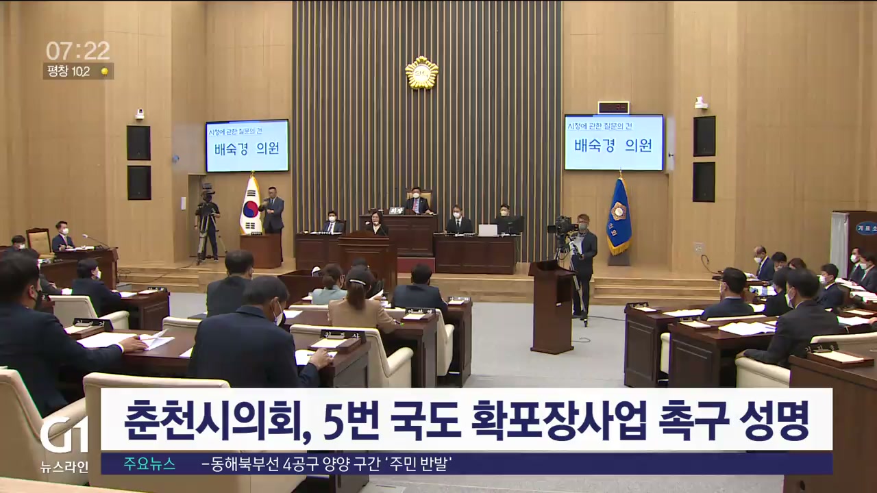 춘천시의회가 춘천-홍천간 5번 국도 확·포장사업 조기 추진을 촉구하고 나섰습니다.