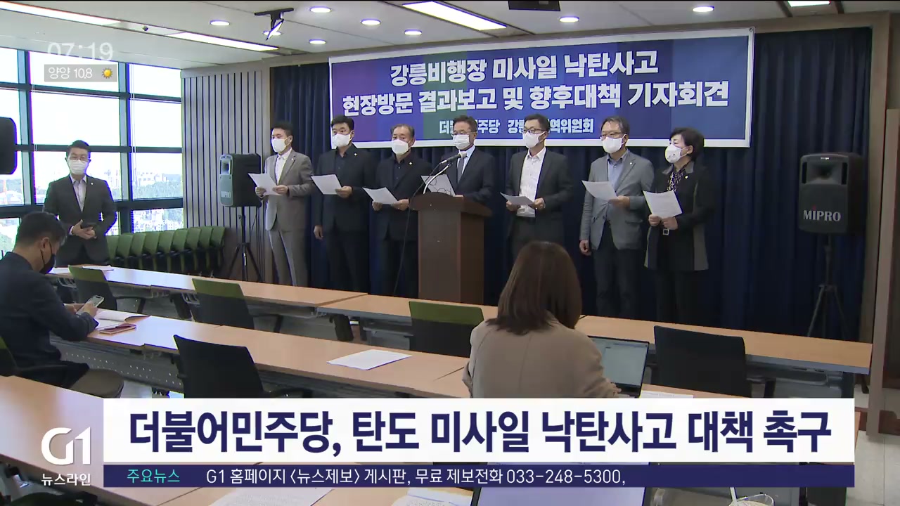 더불어민주당 강릉시지역위원회가 기자회견을 열고 강릉 비행장 탄도 미사일 낙탄사고에 대한 향후 대책 마련을 촉구했습니다.