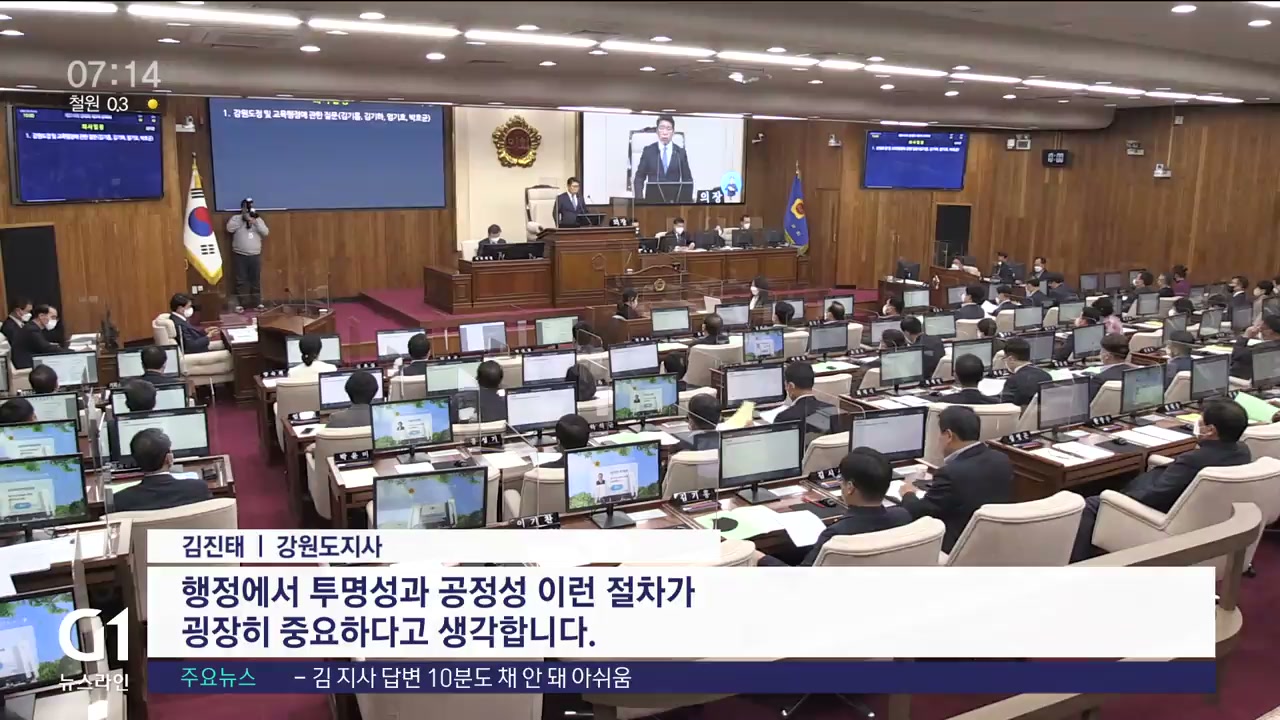 지난 7월 개원한 11대 강원도의회가 김진태 강원도지사를 상대로 첫 도정질의를 벌였습니다.