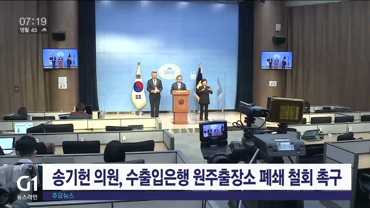 더불어민주당 송기헌 의원은 국회 소통관에서 기자회견을 갖고, 한국수출입은행 원주출장소 폐쇄 계획 철회를 촉구했습니다.