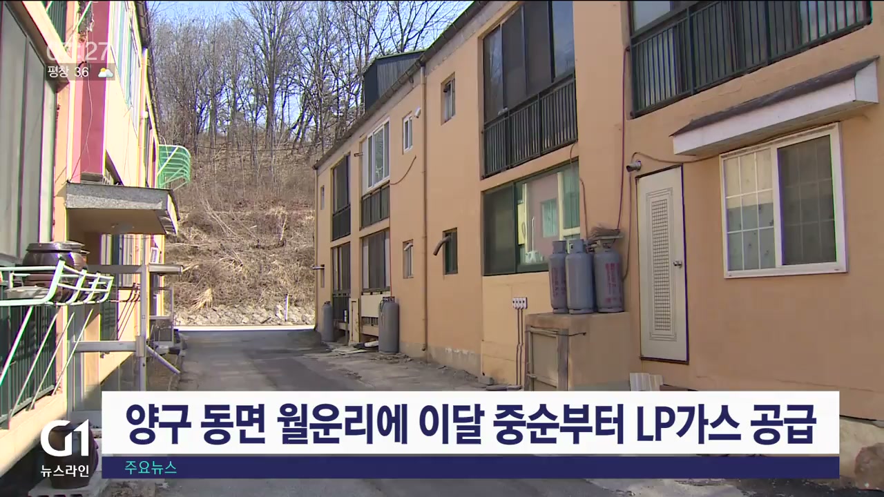 양구군은 동면 월운리 일대 LPG 배관망 구축사업이 마무리됨에 따라 이달 중순부터 31가구에 LP가스를 공급한다고 밝혔습니다.