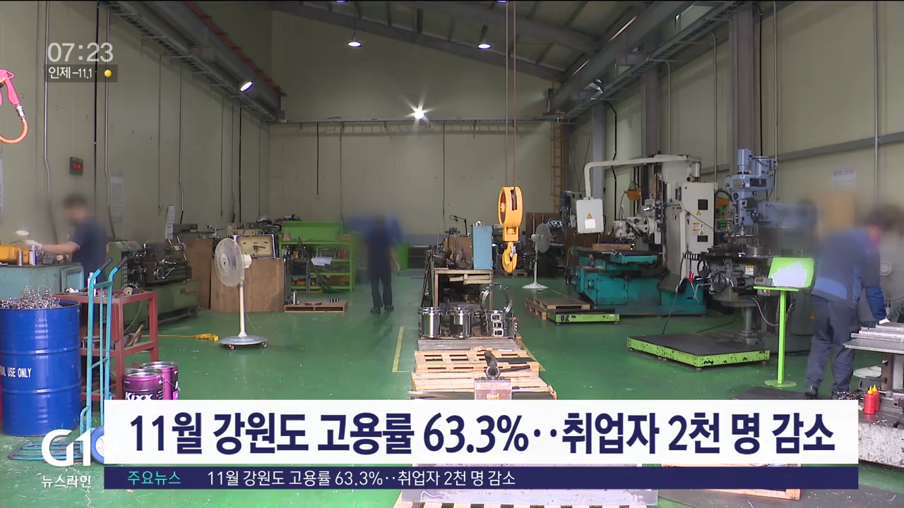 통계청이 발표한 '11월 강원도 고용동향'을 보면, 고용률은 63.3%로 1년 전보다 0.5% 포인트 줄었습니다.