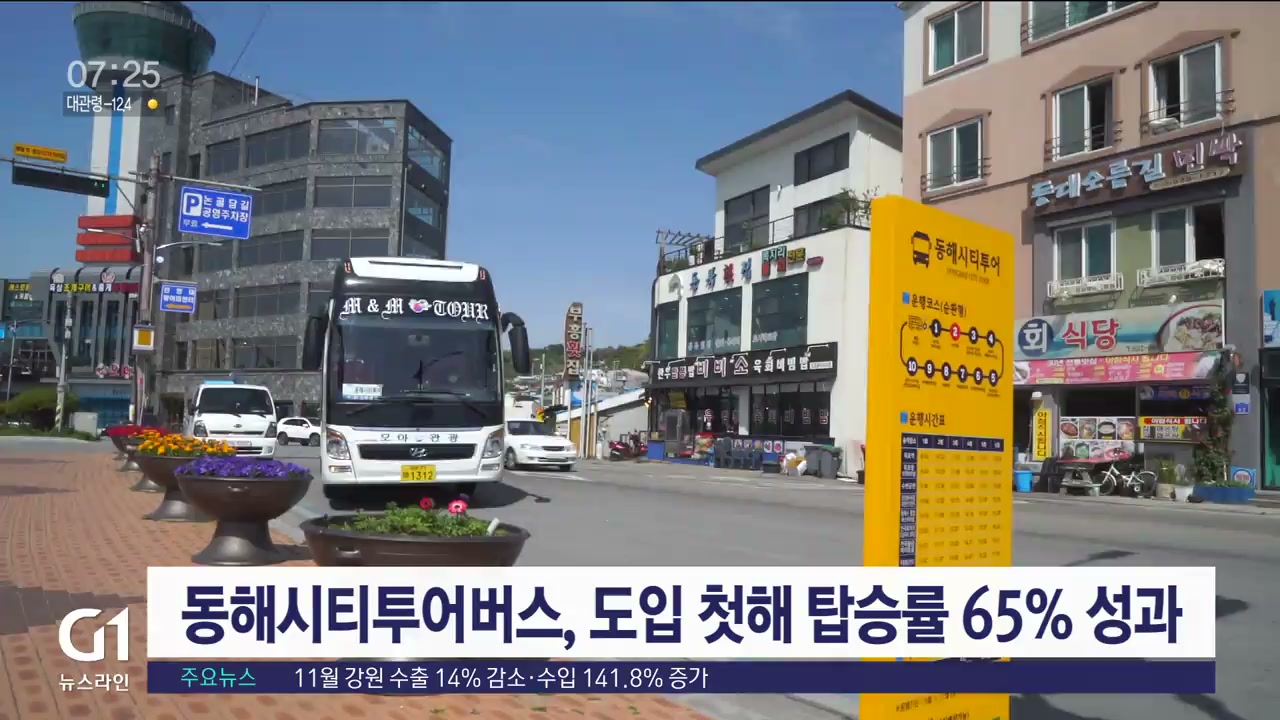 동해시는 지난 5월부터 11월까지 매주 주말과 공휴일에 운행한 동해시티투어버스에 모두 3400명이 탑승해 당초 목표치 보다 높은 65%의 탑승률을 기록했다고 밝혔습니다.
