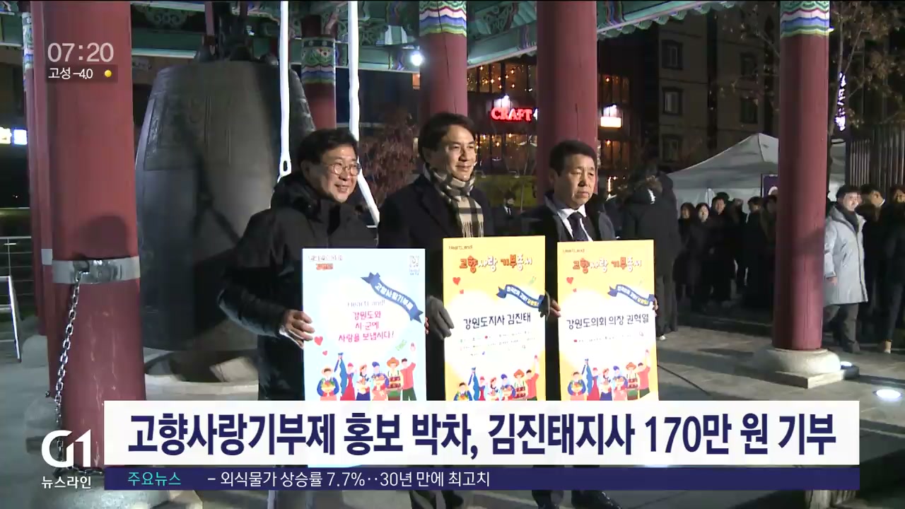 김진태 도지사는 춘천시청 광장에서 열린 2022 해넘이해맞이 타종행사에서 주소지인 춘천을 제외한 도내 17개 시·군에 각각 10만 원씩 모두 170만 원을 기부했습니다.