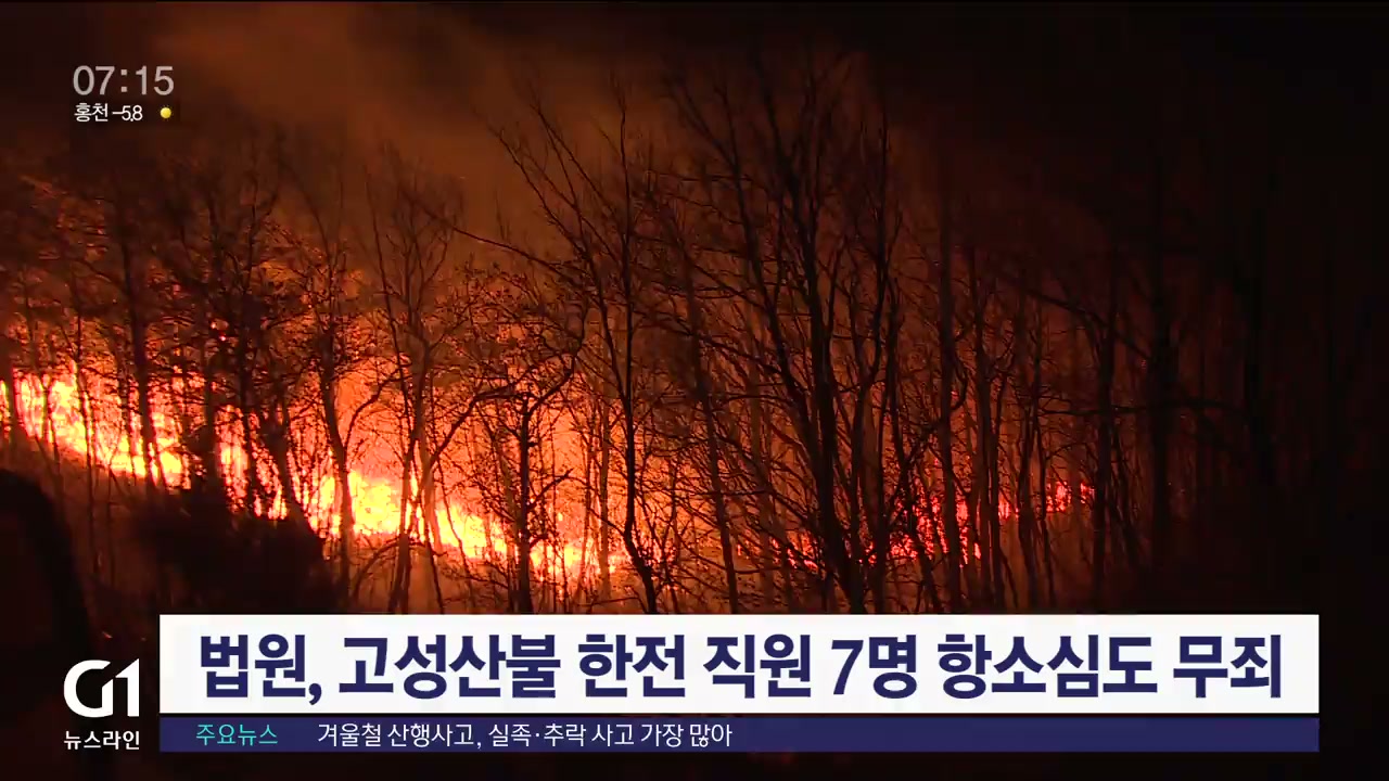 지난 2019년 4월 축구장 1,700개 면적의 산림을 잿더미로 만든 고성산불과 관련해 전·현직 한전 직원들이 1심에 이어 2심에서도 무죄를 선고받았습니다.
