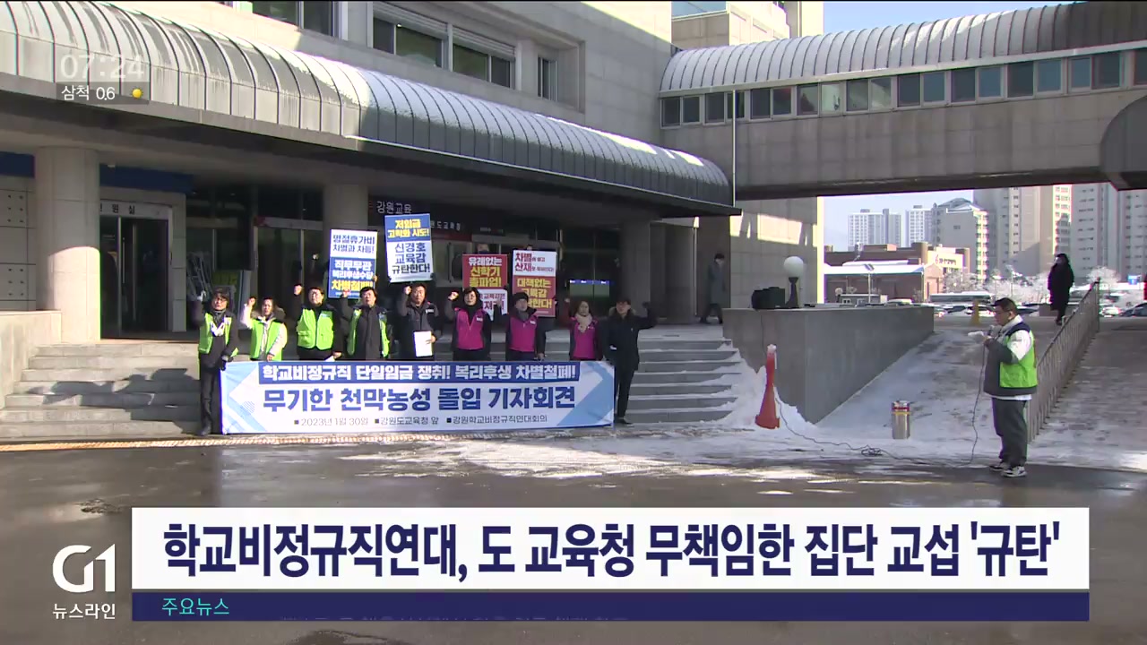 강원학교비정규직연대회의가 도교육청 앞에서 강원도교육청의 무책임한 교섭을 규탄하는 기자회견을 열었습니다.