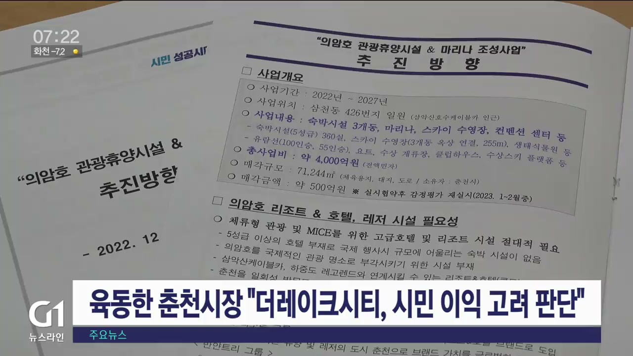 육동한 춘천시장은 "이 사업이 춘천에 도움이 되고 이익에 부합한다고 판단했지만, 경찰 수사 방향 등에 대한 위험 요소를 고려하지 않을 수 없어 최종 협약 체결을 보류했다"고 밝혔습니다.