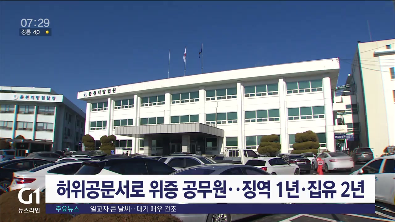춘천지법 형사1부는 위증과 허위공문서 작성 및 행사 등의 혐의로 기소된 39살 A씨에게 징역 1년에 집행유예 2년을 선고했습니다.
