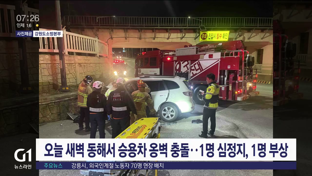 동해서 승용차 옹벽 충돌..1명 심정지, 1명 부상