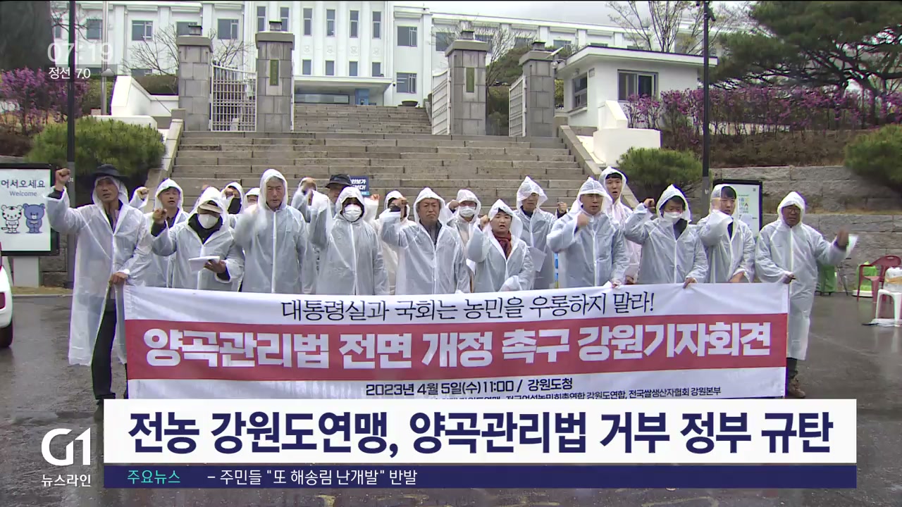 전국농민회총연맹 강원도연맹은 어제(05일) 강원도청 앞에서 기자회견을 열고 양곡관리법 거부권을 행사한 정부를 규탄했습니다.