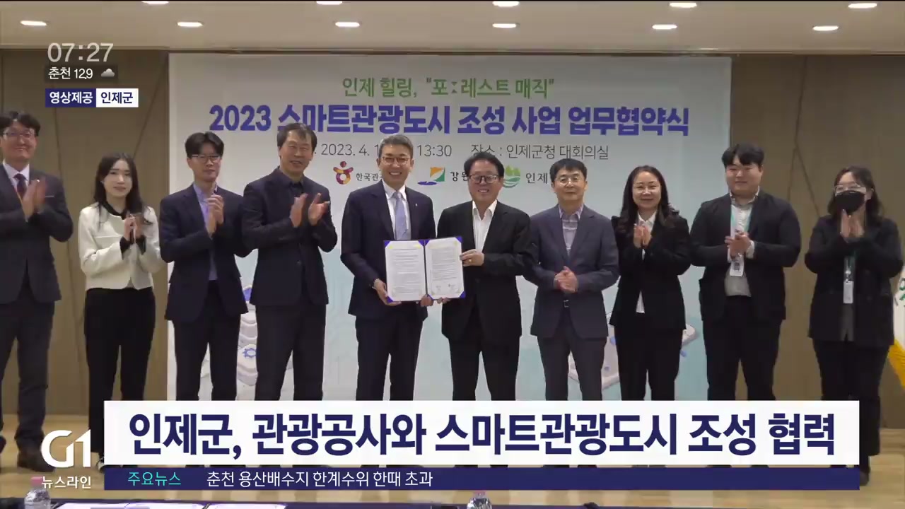 인제군이 스마트 관광도시 조성을 위해 한국관광공사와 어제(10일) 인제군청에서 업무협약을 체결했습니다.