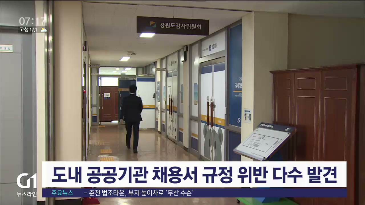 강원도 감사위원회는 시·군 감사관실과 함께 지난해 5월부터 11월까지 70개 공공기관을 대상으로 실시한 채용실태 조사에서 모두 60건의 규정 위반 또는 부적정한 사례를 발견해 조치했다고 밝혔습니다.