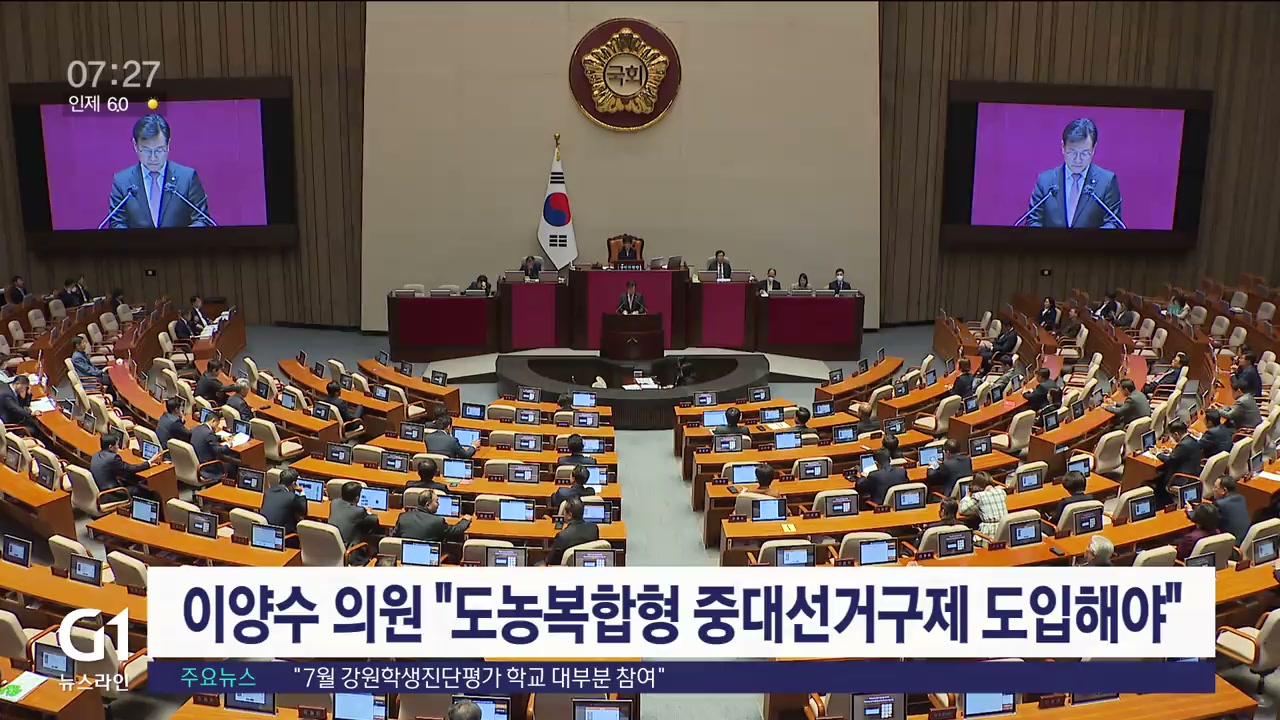 선거제 개편 논의를 위한 국회 전원위원회가 열리고 있는 가운데, 이양수 의원은 도농복합형 중대선거구제 도입을 주장했습니다.