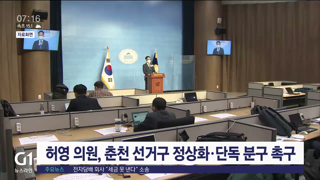 허영 의원과 춘천시의회 더불어민주당 의원들은 어제(19일) 국회에서 기자회견을 갖고, 춘천시 국회의원 선거구의 정상화와 단독 분구를 촉구했습니다.