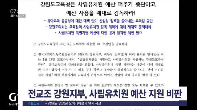 강원도 교육청이 추진 중인 사립유치원 특별 지원 예산 편성과 관련해, 전교조 강원지부가 규탄 성명을 발표했습니다.