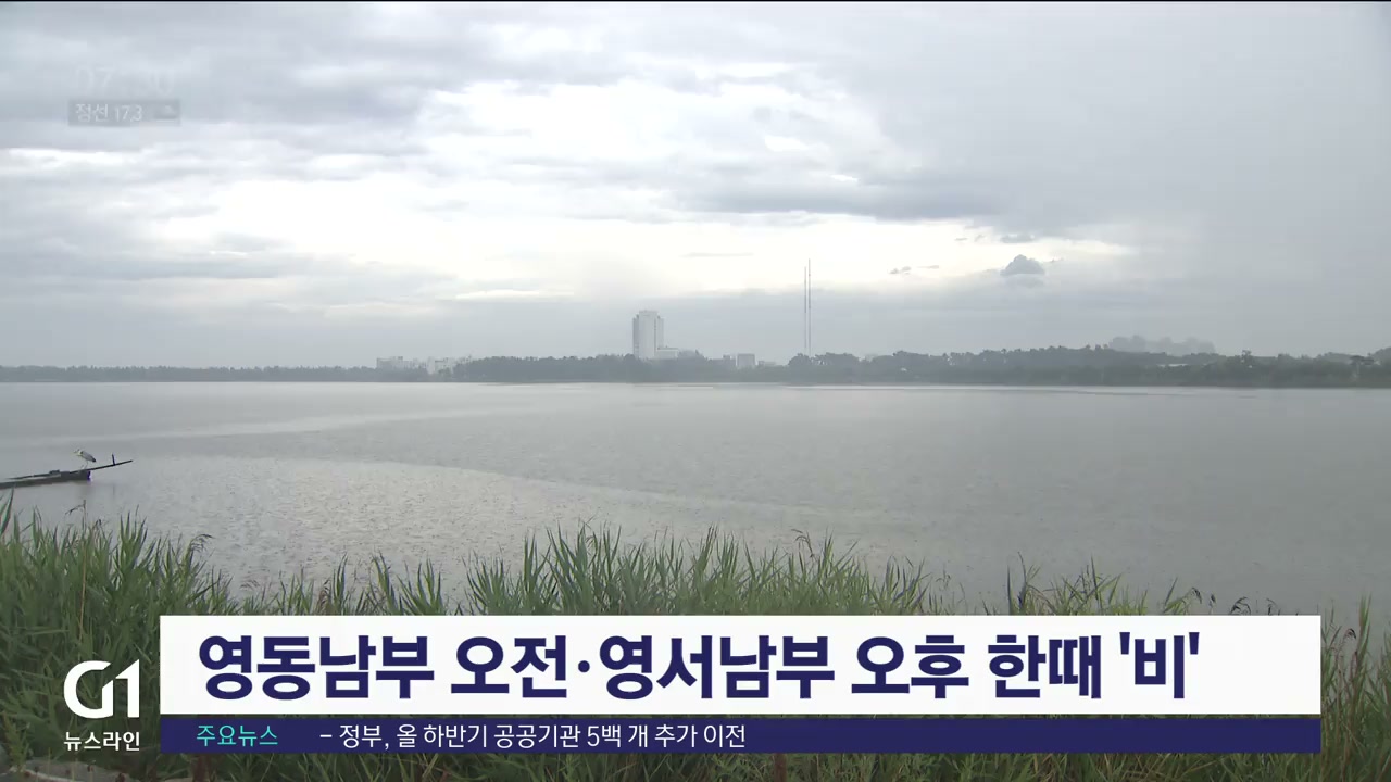 오늘 강원도는 대체로 구름 많은 가운데, 영동 남부 지역은 오전 한때, 영서 남부 지역은 오후 한때 비가 내리는 곳이 있겠습니다.