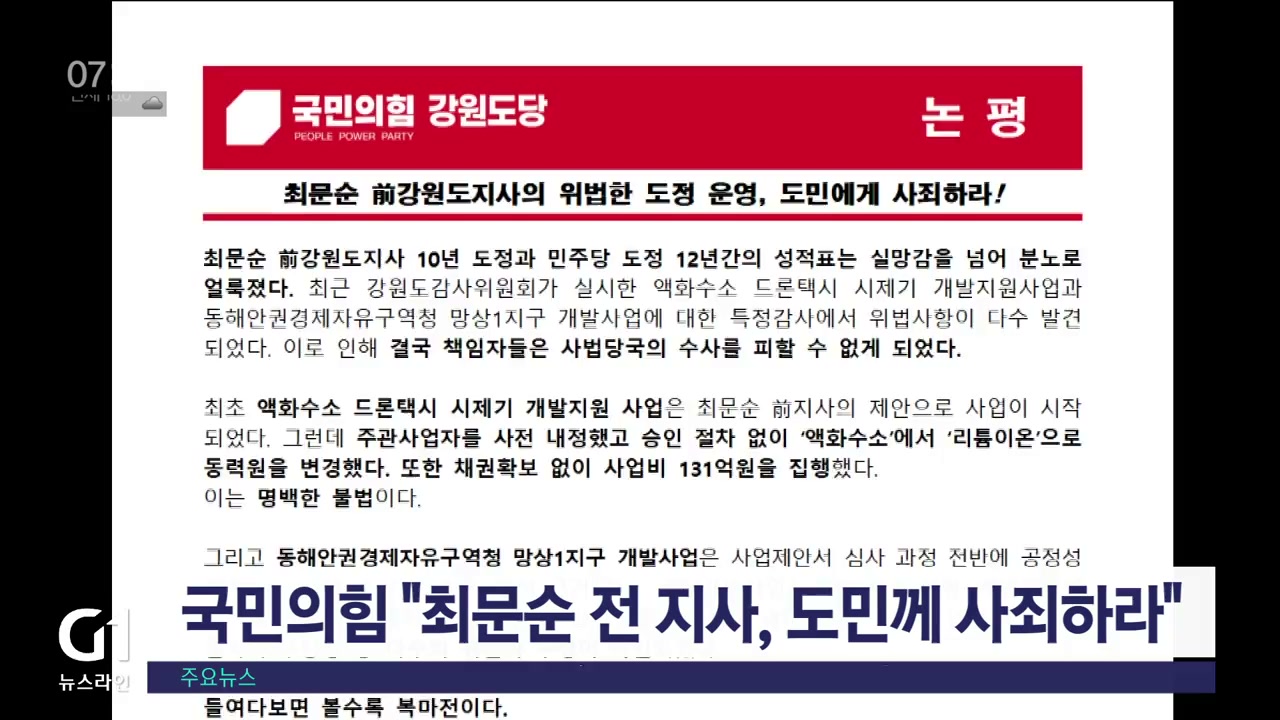 국민의힘 강원도당이 오늘(6일) 논평을 내고 최문순 전 강원도지사를 향해 "도민에게 사죄하라"고 촉구했습니다.
