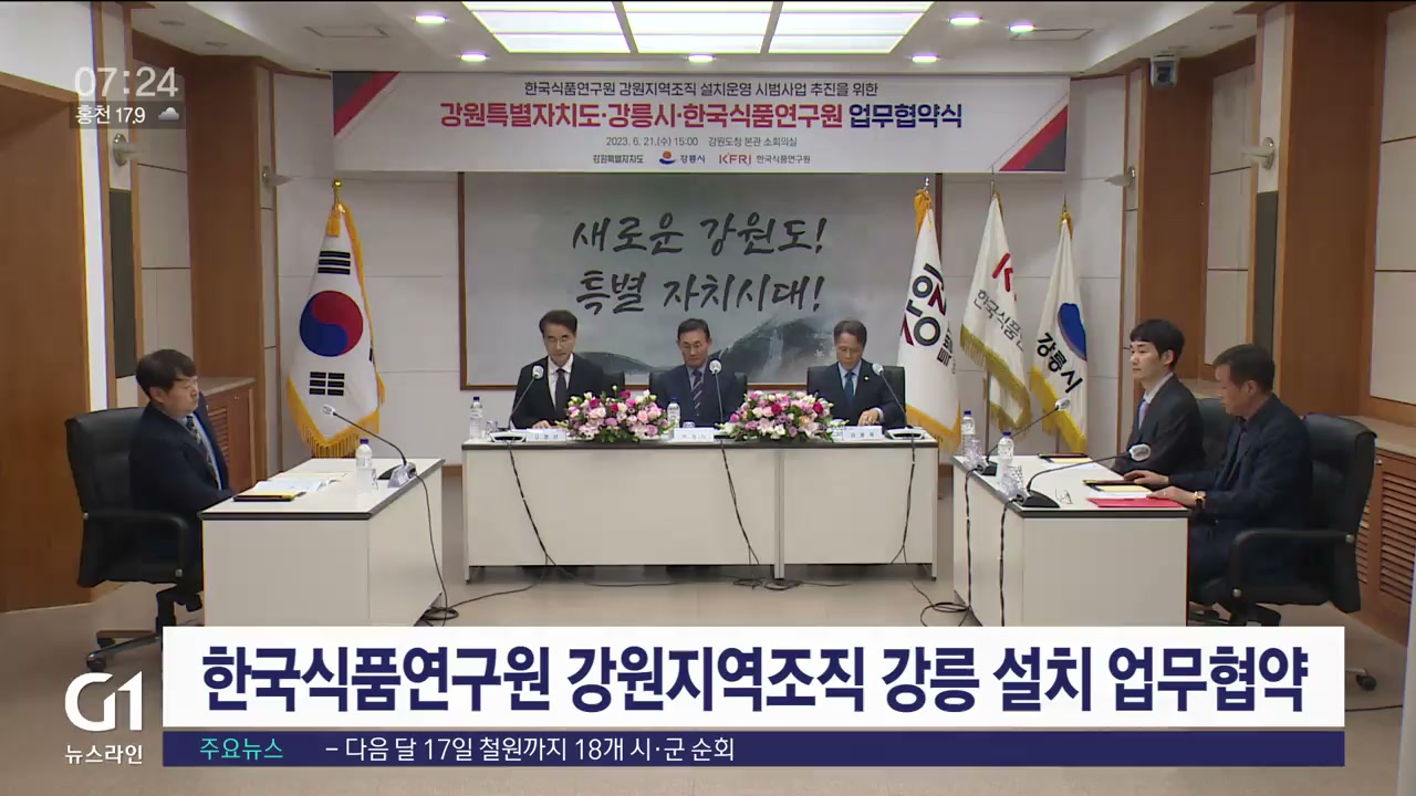 강원특별자치도와 강릉시, 한국식품연구원은 식품·바이오 천연물 소재 개발 R&D 협력과 시범사업 연구비 지원 등에 대한 업무 협약을 체결했습니다.