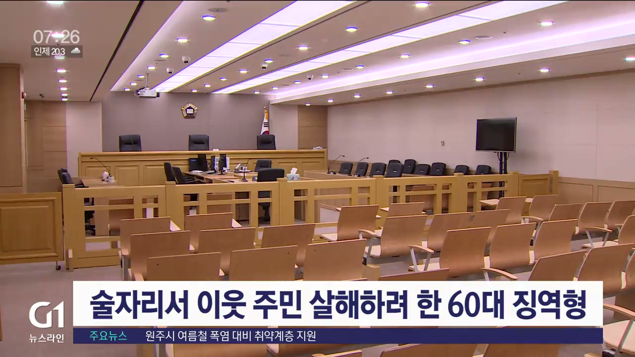 A 씨는 지난 4월쯤 횡성의 한 식당에서 이웃 주민 B 씨와 술을 마시던 중 사소한 시비로 폭행을 당하자 이에 앙심을 품고 흉기로 B 씨를 7차례 찔러 살해하려 한 혐의로 재판에 넘겨졌습니다.