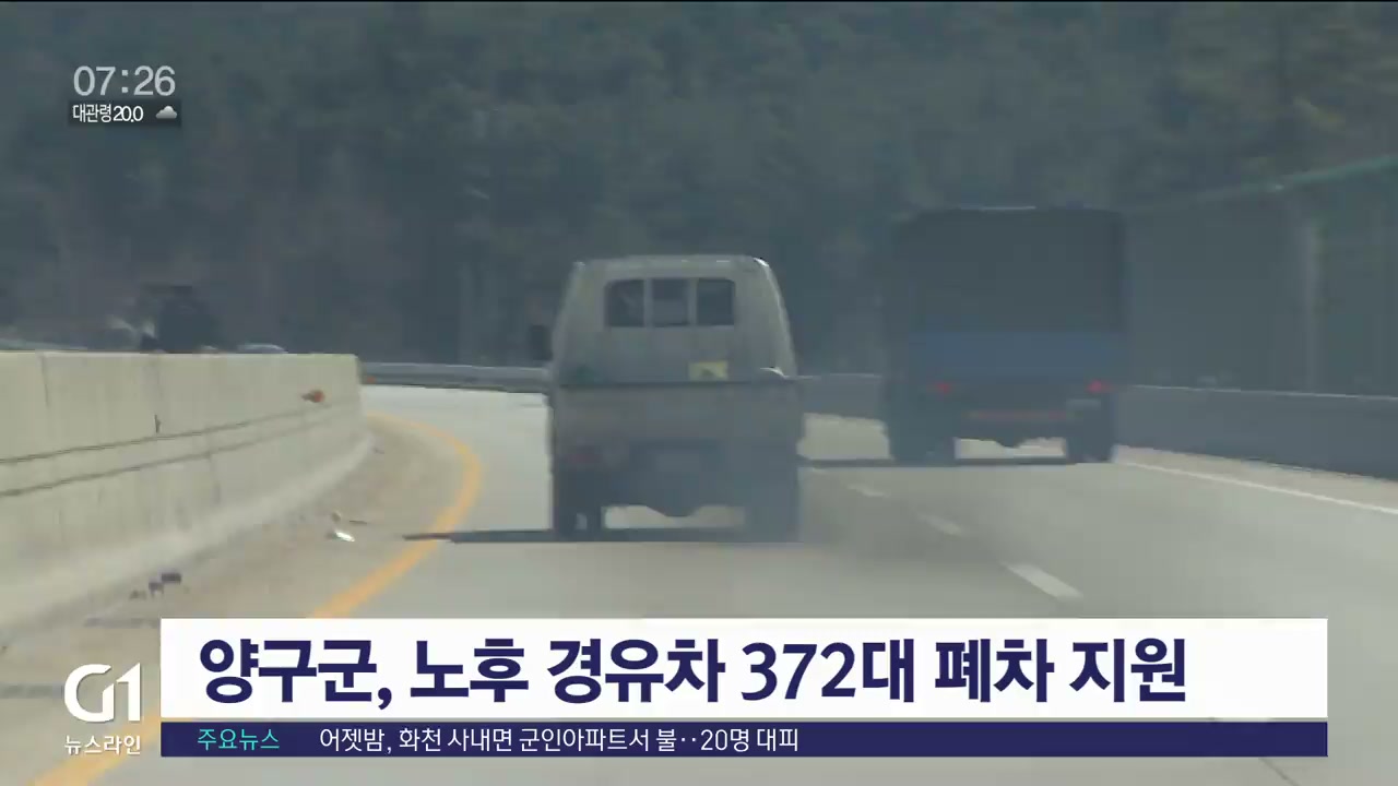 양구군은 미세먼지와 배출가스 감축을 위해 오는 10월까지 8억 원을 들여 372대의 노후 경유차 조기 폐차를 지원한다고 밝혔습니다.