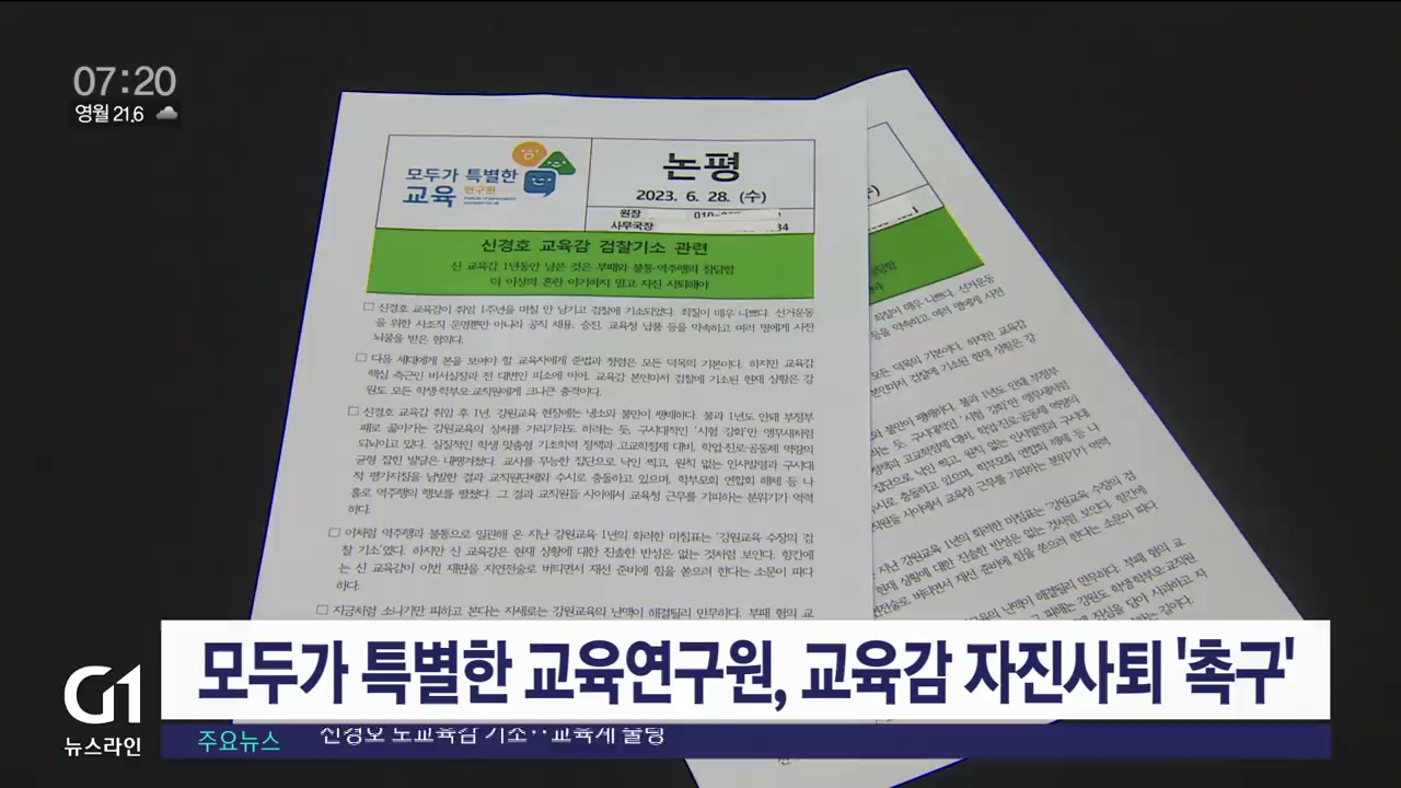 신경호 도교육감이 교육자치법 위반 등의 혐의로 기소된 것과 관련해, 모두가 특별한 교육연구원이 논평을 내고 신 교육감의 자진 사퇴를 촉구했습니다.