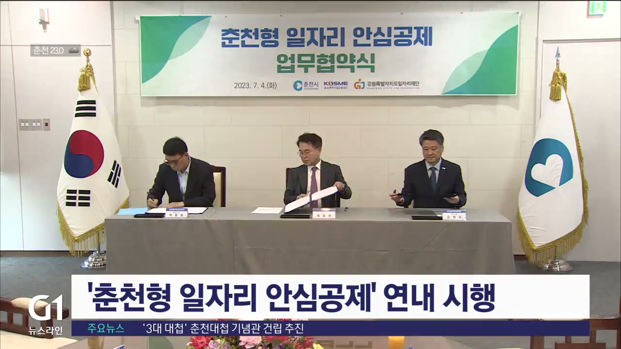 춘천시와 중소벤처기업진흥단, 강원특별자치도일자리재단은 어제(4일) 춘천시청에서 업무협약을 맺고, 춘천형 일자리 안심공제 사업에 협력하기로 했습니다.