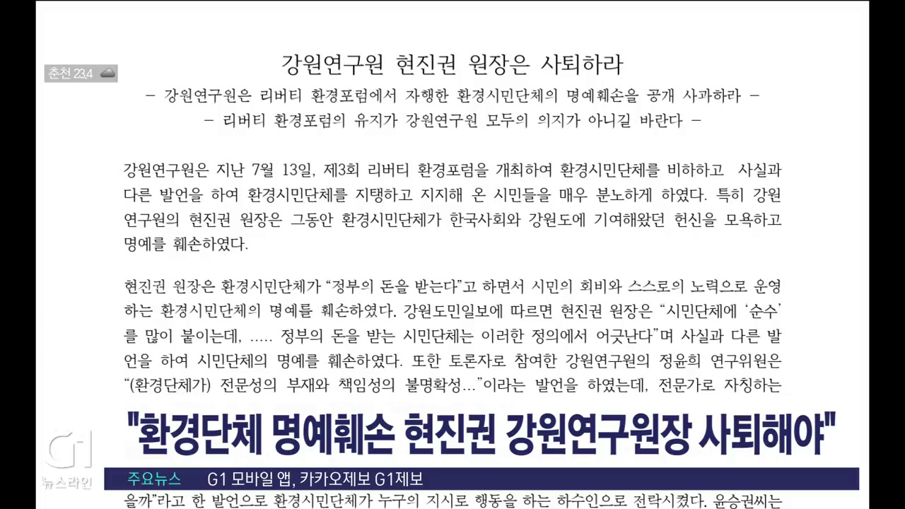 강원시민사회단체연대회의는 입장문을 내고 "현진권 강원연구원장이 환경단체의 명예를 훼손했다"며 사과와 원장직 사퇴를 요구했습니다.