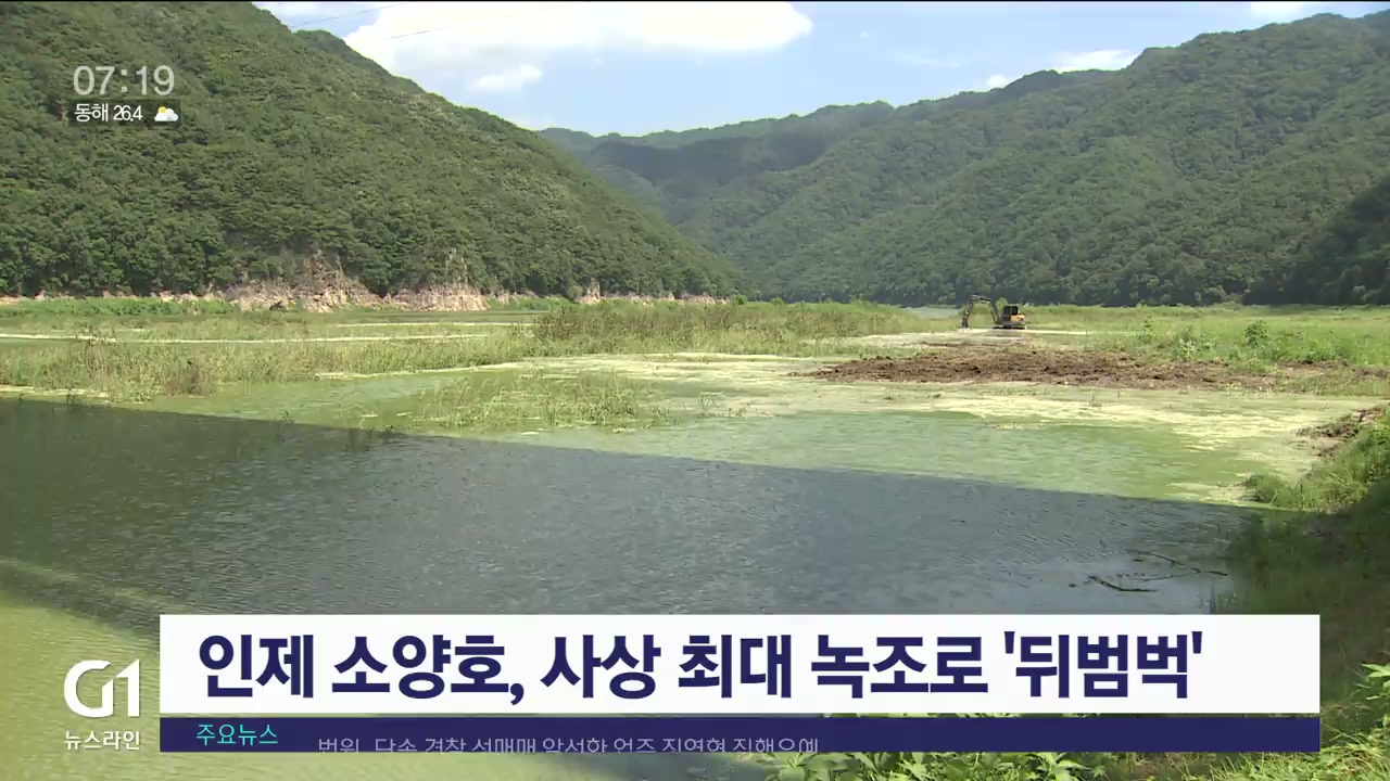 긴 장마에 이은 폭염으로 소양호 상류에 역대급 녹조가 발생했습니다.