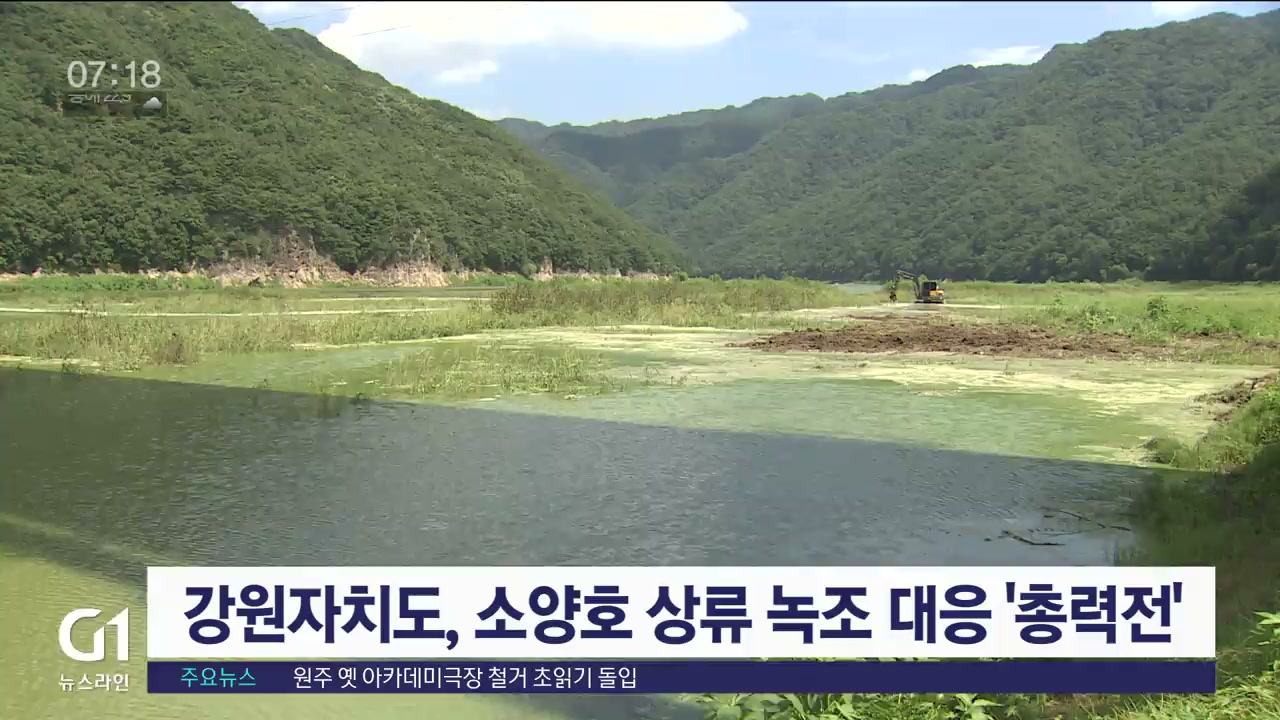 도는 원주지방환경청, 한국수자원공사, 양구군, 인제군과 공동으로 소양호 상류에 3차 차단막을 설치한데 이어, 선박과 중장비, 인력을 투입해 물순환 개선과 조류 제거 작업을 하고 있다고 밝혔습니다.
