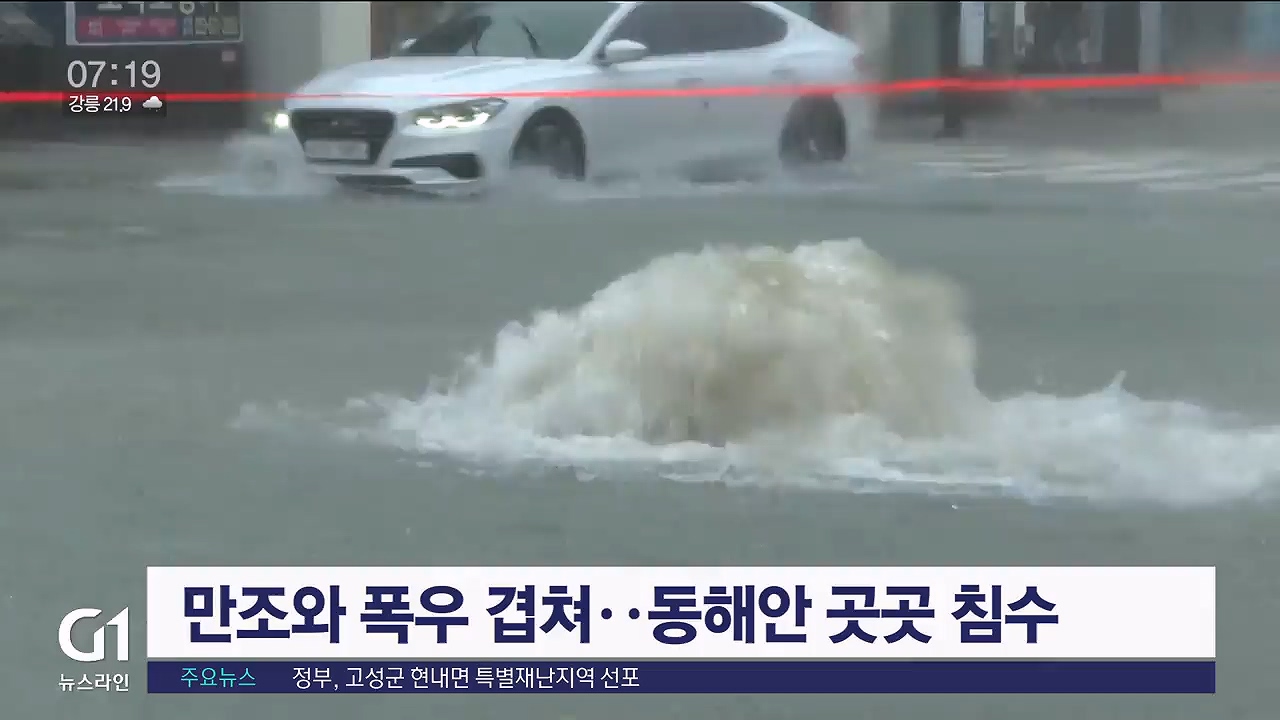 "태풍이 북상하면서 동해안은 만조시간대가 10일 오전 9~11시에 속초와 같은 경우는 해수면 높이가 70cm 내외, 저녁에는 80cm 까지 계속 상승하였고, 동해중부 앞바다에서 3~5m의 높은 파도까지 더해지면서..."