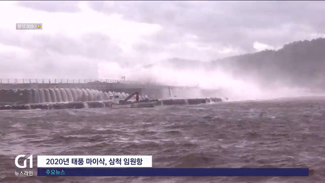집채 보다 큰 파도가 방파제를 넘어 항구를 덮칩니다.