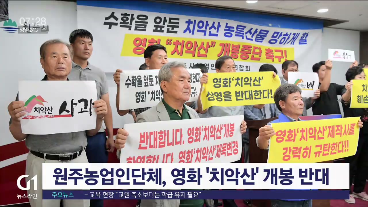 원주 농업인단체연합회는 "치악산 복숭아와 배, 사과 등의 수확시기를 앞둔 시기에 영화를 개봉하는 것은 농민들을 궁지로 몰아넣는 행위"라며 "영화 개봉을 결사 반대한다"고 밝혔습니다.