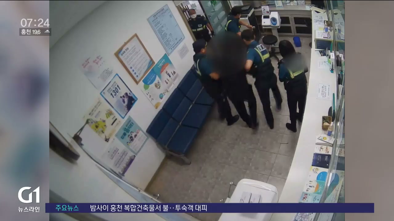 경찰이 쏜 테이저건을 맞고서야 민원실 바닥에 쓰러집니다.