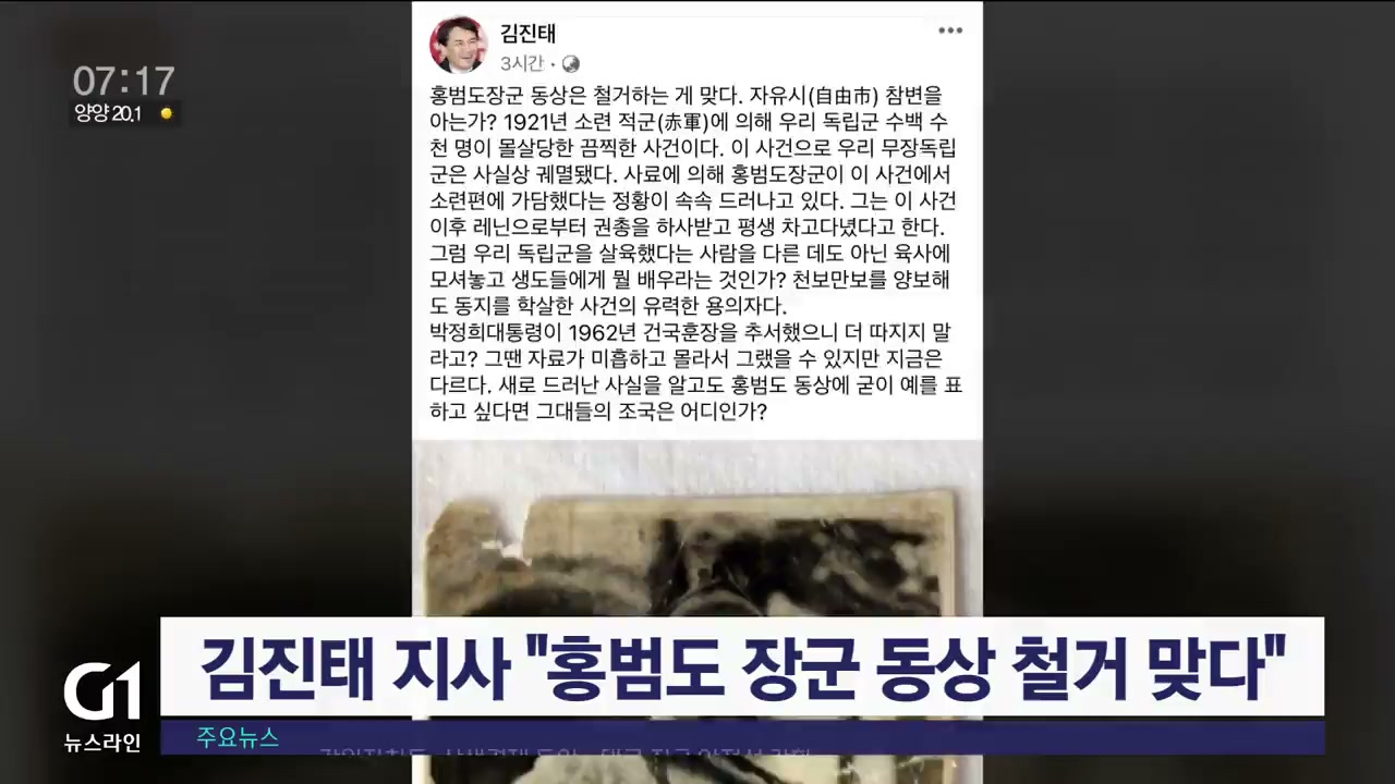 홍범도 장군 흉상 이전 문제가 이념논쟁으로 번지고 있는 가운데 김진태 지사가 어제(31일) "홍범도 장군의 동상은 철거하는 게 맞다"고 주장했습니다.