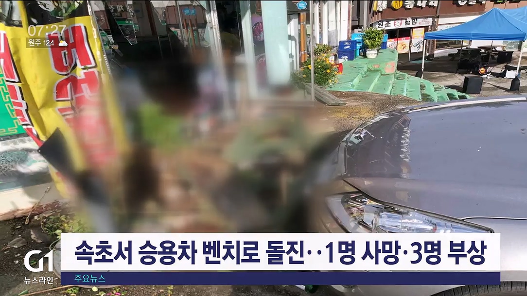 어제(8일) 오후 3시 2분쯤 속초시 설악동에서 50대 A씨가 몰던 승용차가 식당 앞 벤치를 들이받아 60대 B씨가 숨지고, 함께 있던 60대 3명이 다쳐 병원으로 옮겨졌습니다.