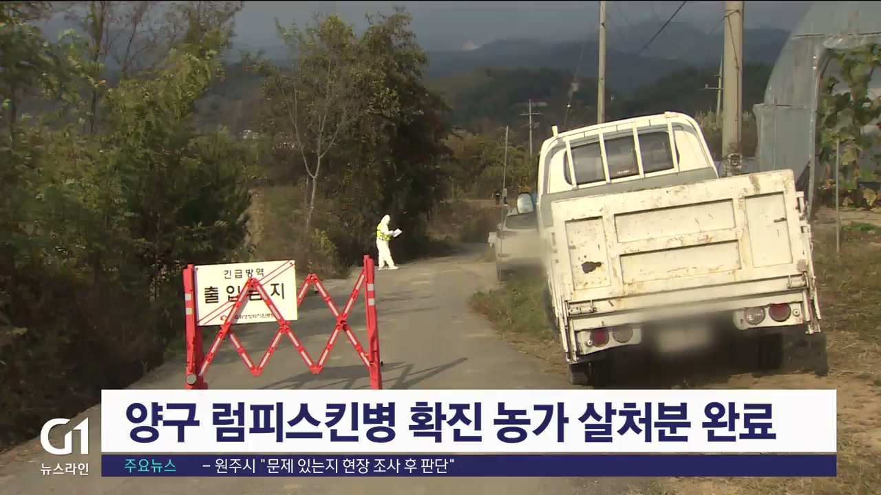 양구군은 럼피스킨병 확진 한우농가의 소 30마리에 대한 긴급 살처분을 완료했다고 밝혔습니다.