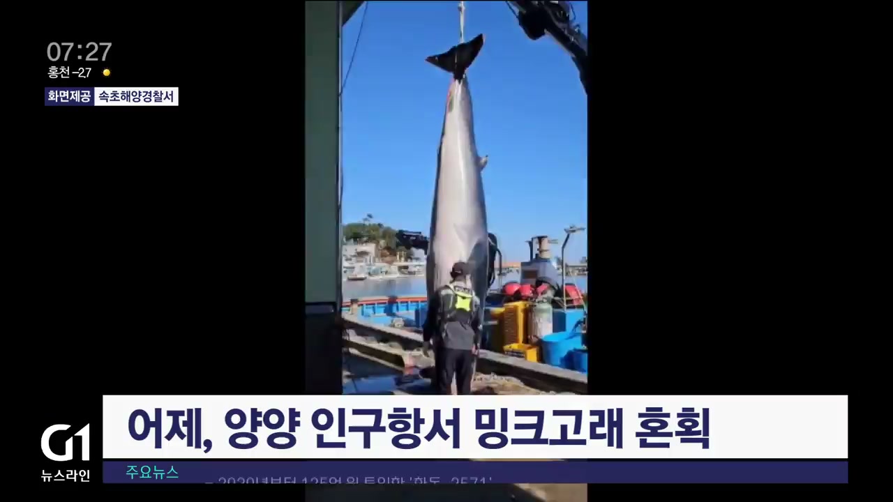 속초해양경찰서는 어제(20일) 오전 10시 57분쯤 양양 인구항 동쪽 1.8km 해상에서 조업 중이던 어선에 밍크고래가 혼획됐다고 밝혔습니다.