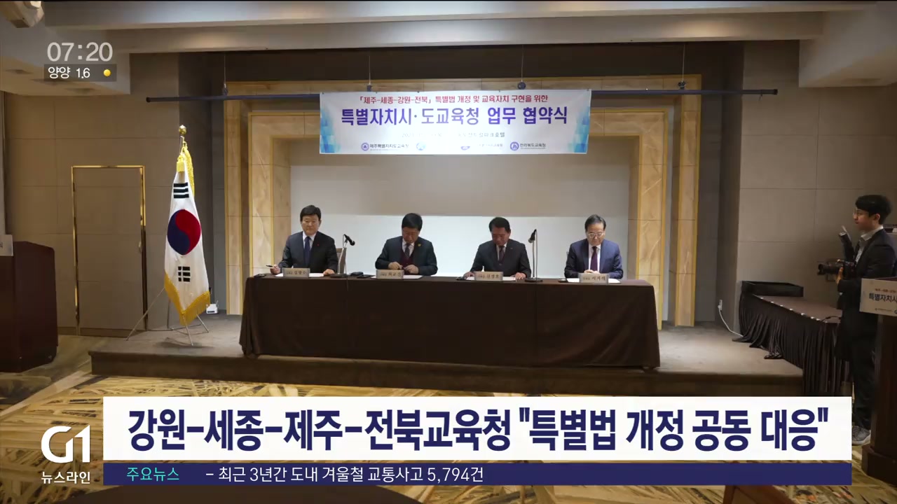 강원과 세종, 제주, 전북 지역 교육청이 '특별자치시·도교육청 업무협약'을 체결하고, 교육분야 특별법 개정에 공동 대응하기로 했습니다.