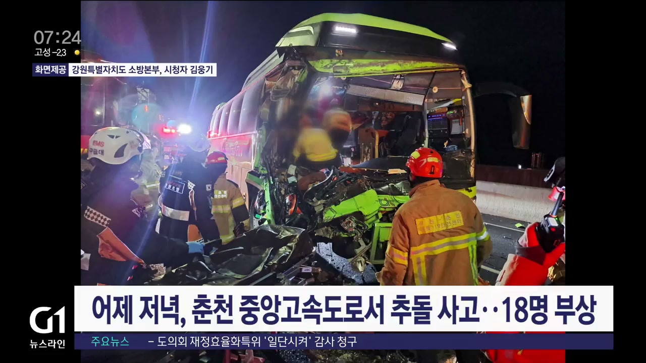 어제(28일) 저녁 7시 28분쯤 춘천시 동산면 봉명리 중앙고속도로 춘천 방향 봉면2교에서 관광버스가 화물차를 추돌했습니다.