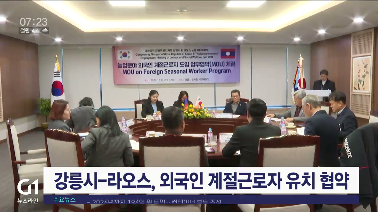 강릉시는 라오스 노동사회복지부와 외국인 계절근로자 유치 협력 협약을 체결하고, 올해 18개 농가에 59명의 인력 배치를 합의했습니다.