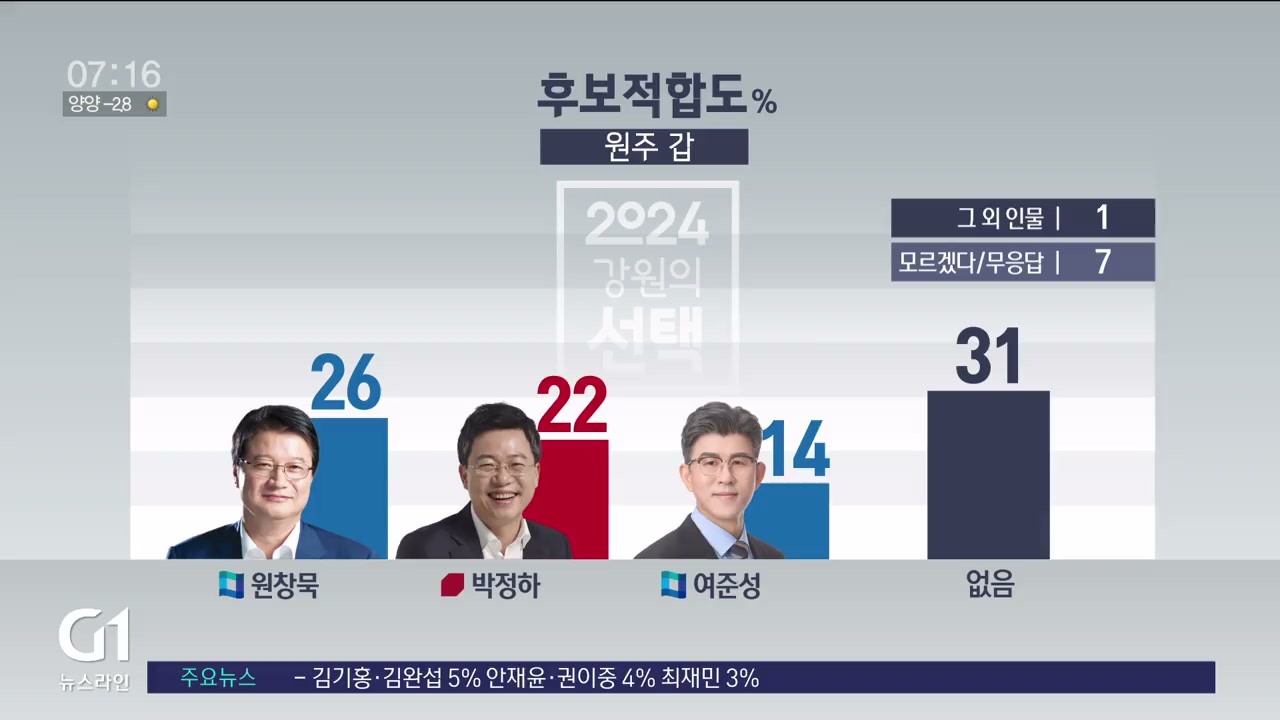 원창묵 전 원주시장 48%, 여준성 전 대통령비서실 비서관이 23%로 나왔고,